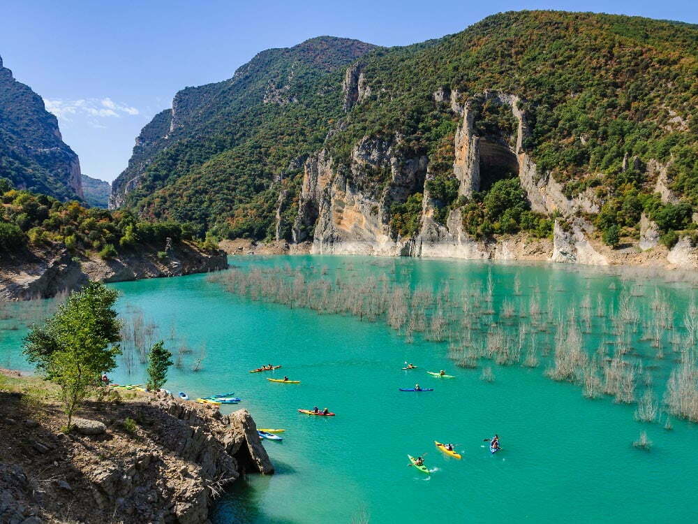 Actividad de kayak por el embalse de Canelles, rodeados de paredes verticales y aguas turquesas